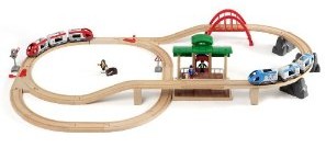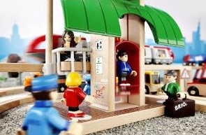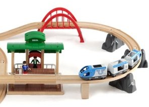 Das große Reisezug Set bringt die Fahrgäste von einem Zug zum anderen. Die blaue Linie wird von einer Batterielok zur modernen Haltestelle gezogen. Dort können die Passagiere in die rote Linie umsteigen. Vom Untergeschoß gelangt der Fahrgast mithilfe des mecha...